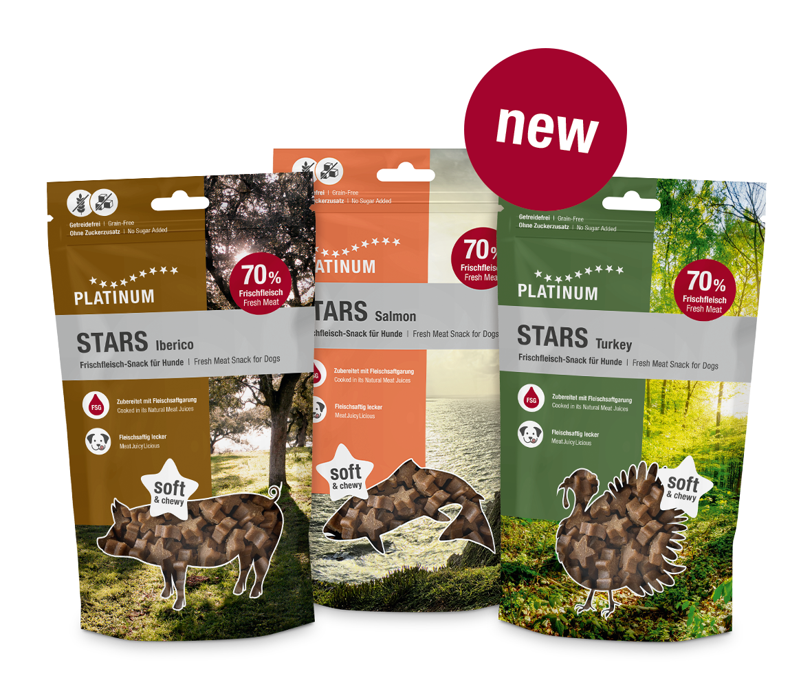 We are also launching three new snack varieties: Turkey, Salmon, and Iberico – naturally prepared using our usual Fleischsaftgarung method. At the same time, our snacks will adopt a new, consistent name: the PLATINUM Stars.